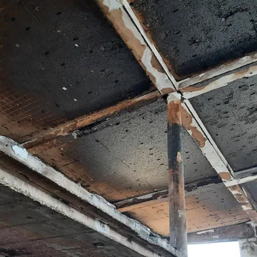 A reinforced concrete beam showing severe structural damage with full deterioration of the reinforcement.